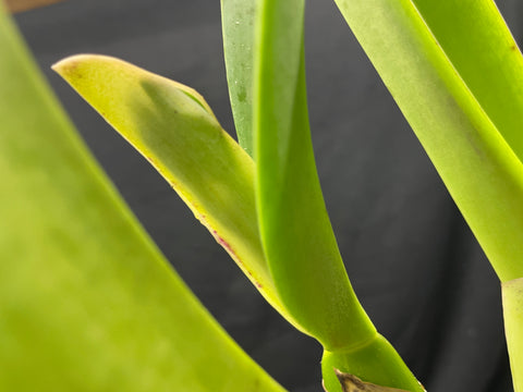 Water should be provided in two ways: in the pot by watering and in the air as humidity. Watering in the container is dictated by many criteria: size and type of the vessel, temperature, light, etc. Mature cattleyas need to dry out thoroughly before being watered again. Seedlings need more constant moisture. Compare the weight of a dry pot of the same size and type of mix; it can indicate if a plant needs water by the relative weight - light means dry, heavy means wet. If in doubt, it's best to wait a day or two until watering. Plants in active growth need more water than plants that are resting. Water below 50 F may injure plants, as will water softened by the addition of salts.