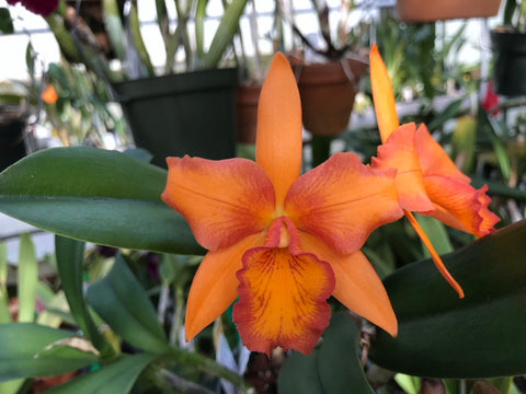 Original plant. I selected this out of a group of seedling Blc. Fuchs Orange Nuggett x self that we had gotten in from Orchid Center (OC-2133). Most were very consistent, but this particular plant bloomed with a dark picotee edge. We had this plant awarded 79 points in 2005.