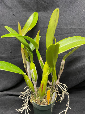 Potting is necessary when the rhizome of the plants protrudes over the edge of the pot or the potting medium starts to break down and drain poorly (usually after two to three years). It is best to repot just before new roots sprout from the rhizome, after flowering or in the spring. Mature cattleyas are usually potted in coarser potting material than are seedlings. Until a plant has at least six mature pseudobulbs, it generally should be put into a larger pot and not divided. If dividing a plant, three to five pseudobulbs per division are required. Select a pot that will allow for approximately two years of growth before crowding the pot. Pile mix against one side of the pot and cut off any dead roots. Spread the firm, live roots over the pile, with the cut rhizome against the side of the pot. Fill the pot with medium, working it around the roots. Pack firmly and stake if necessary. Keep the plant humid, shaded and dry at the roots until new root growth is seen.