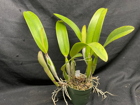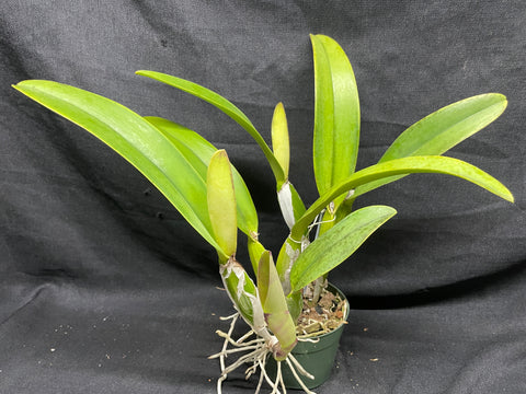 Potting is necessary when the rhizome of the plants protrudes over the edge of the pot or the potting medium starts to break down and drain poorly (usually after two to three years). It is best to repot just before new roots sprout from the rhizome, after flowering or in the spring. Mature cattleyas are usually potted in coarser potting material than are seedlings. Until a plant has at least six mature pseudobulbs, it generally should be put into a larger pot and not divided. If dividing a plant, three to five pseudobulbs per division are required. Select a pot that will allow for approximately two years of growth before crowding the pot. Pile mix against one side of the pot and cut off any dead roots. Spread the firm, live roots over the pile, with the cut rhizome against the side of the pot. Fill the pot with medium, working it around the roots. Pack firmly and stake if necessary. Keep the plant humid, shaded and dry at the roots until new root growth is seen.