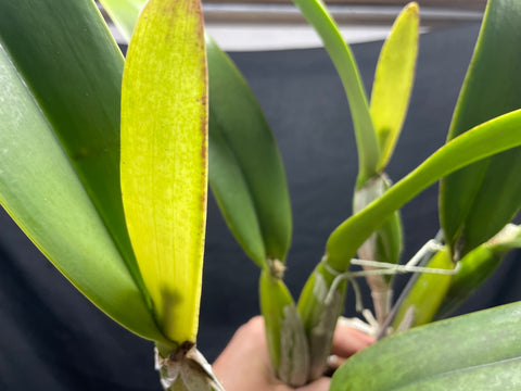 Water should be provided in two ways: in the pot by watering and in the air as humidity. Watering in the container is dictated by many criteria: size and type of the vessel, temperature, light, etc. Mature cattleyas need to dry out thoroughly before being watered again. Seedlings need more constant moisture. Compare the weight of a dry pot of the same size and type of mix; it can indicate if a plant needs water by the relative weight - light means dry, heavy means wet. If in doubt, it's best to wait a day or two until watering. Plants in active growth need more water than plants that are resting. Water below 50 F may injure plants, as will water softened by the addition of salts.