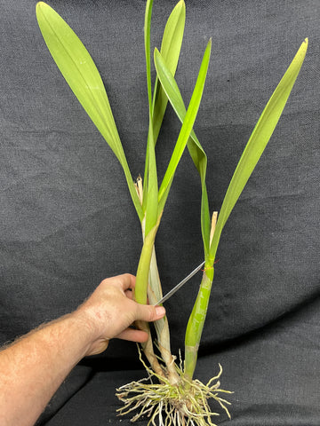 Potting is necessary when the rhizome of the plants protrudes over the edge of the pot or the potting medium starts to break down and drain poorly (usually after two to three years). It is best to repot just before new roots sprout from the rhizome, after flowering or in the spring. Mature cattleyas are usually potted in coarser potting material than are seedlings. Until a plant has at least six mature pseudobulbs, it generally should be put into a larger pot and not divided. If dividing a plant, three to five pseudobulbs per division are required. Select a pot that will allow for approximately two years of growth before crowding the pot. Pile mix against one side of the pot and cut off any dead roots. Spread the firm, live roots over the pile, with the cut rhizome against the side of the pot. Fill the pot with medium, working it around the roots. Pack firmly and stake if necessary. Keep the plant humid, shaded and dry at the roots until new root growth is seen.